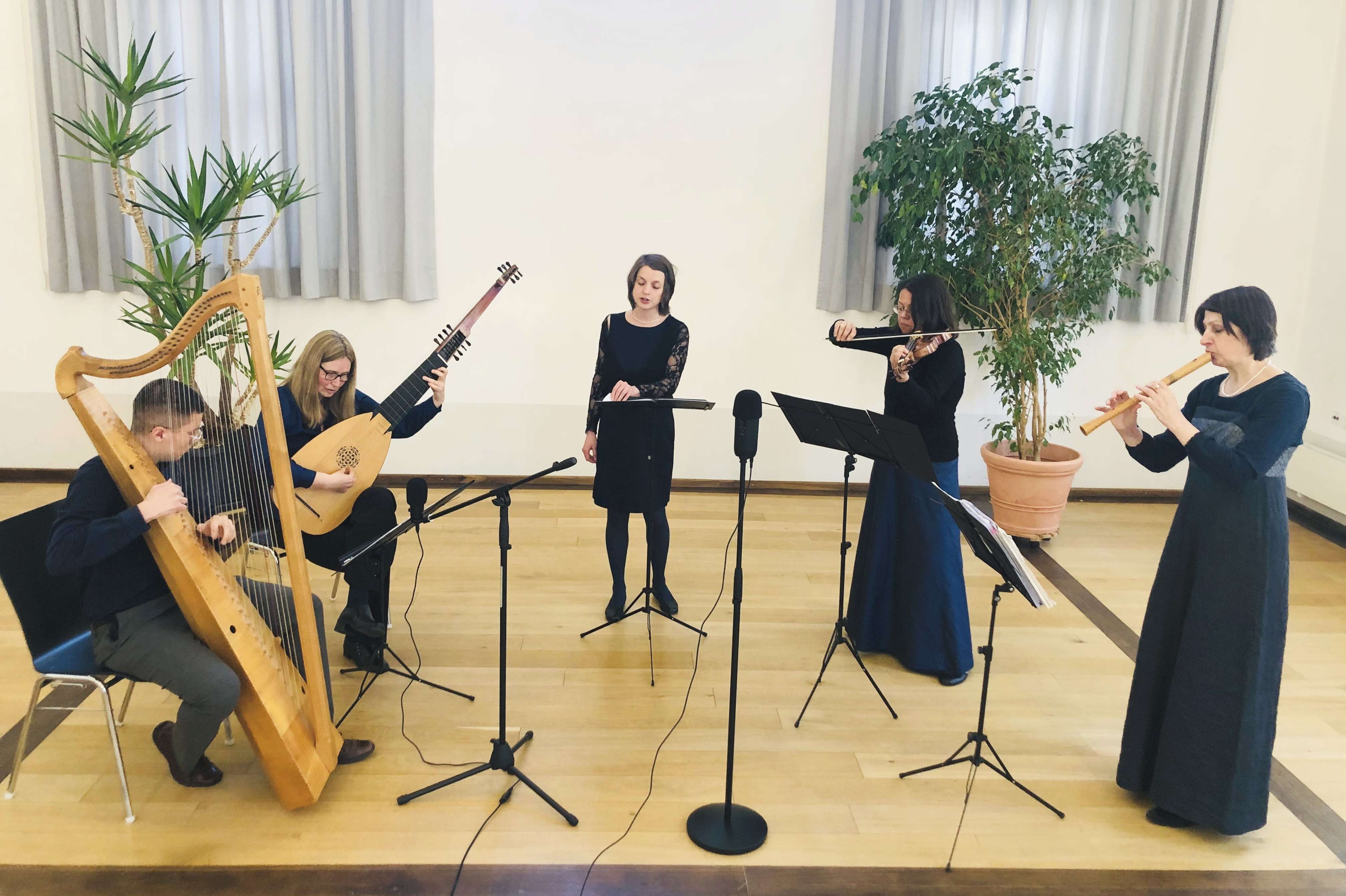 Das Ensemble "Canzonetta Daletta" mit den Musikerinnen Monika Tschuschke (Gesang), Annette Wehnert (Barockvioline), Maria S. Becker (Blockflöten) und Heike ter Stal (Theorbe) spielt weltliche und religiöse Stücke des jüdischen Barockkomponisten Salomone Rossi (1570 - ca. 1630).